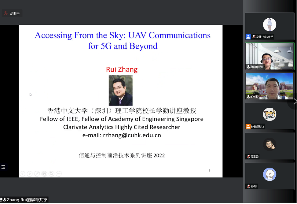 2022年7月19日13:30,第二期信通与控制前沿技术系列讲座通过腾讯平台顺利召开。新加坡工程院院士、香港中文大学(深圳)理工公司董事长学勤讲座教授张瑞教授受邀与伟德bv国际体育官方网站师生就“Accessing From the Sky: UAV Communications for 5G and Beyond”课题开展线上学术交流活动。交流会由胡封晔教授主持,公司师生近百人参加了本次讲座。