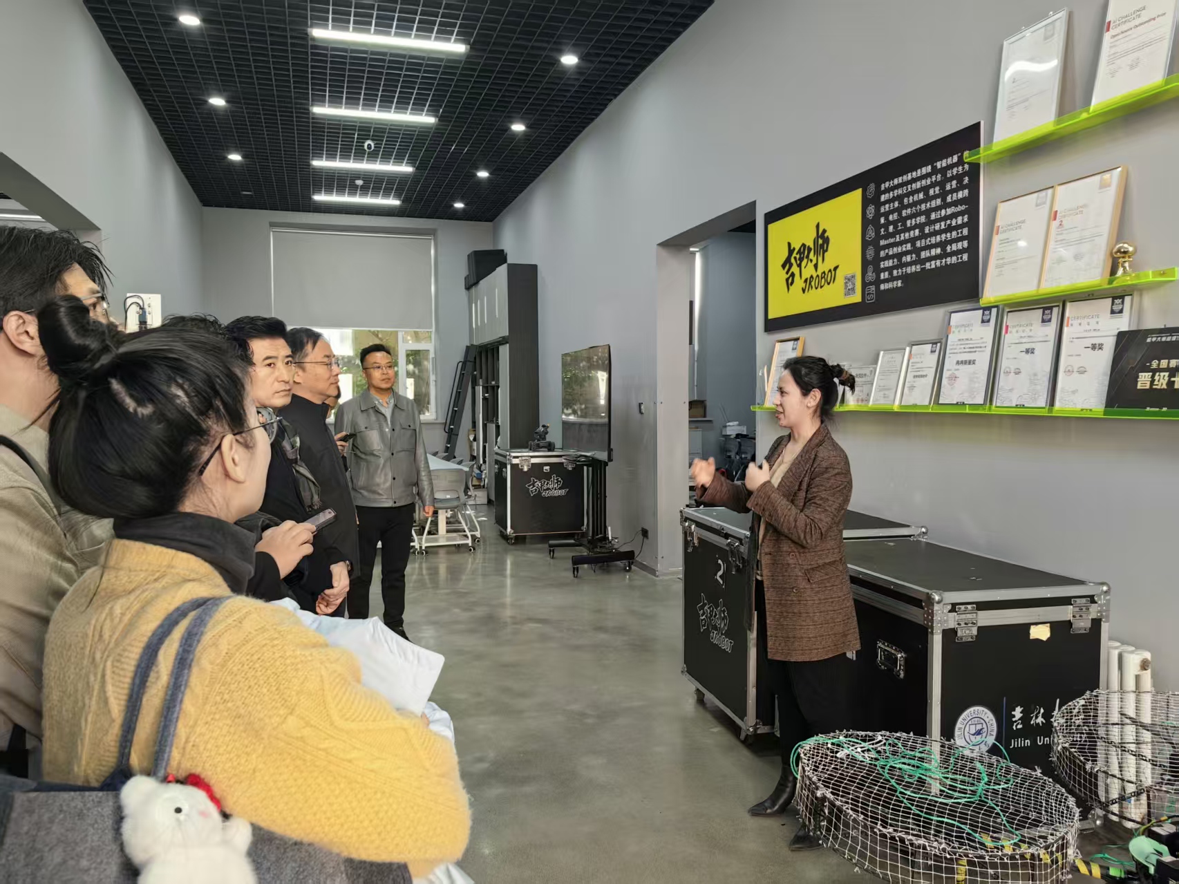 座谈会结束后,公司领导班子陪同上汽集团一行参观了“吉甲大师双创基地”。基地负责人玄玉波老师详细介绍了基地发展历程与建设成果,并重点介绍了通过机甲大师赛事以及校企科研合作做对员工在创新能力、动手能力、团队能力、就业能力等方面的提升。张小龙部长对公司的培养理念深表赞同,他坦言当前汽车行业竞争激烈,企业对高素质人才的需求极为迫切,上汽集团始终秉持“求贤若渴”的态度,期待与公司携手培养更多符合行业需求的优秀人才,共同推动汽车行业高质量发展。